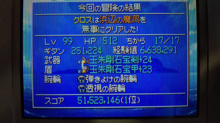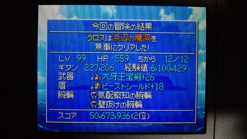 アーマード・コア ラストレイヴンも購入したのにシレンばっかりです。 先日、強制的にレベル1での攻略を余儀なくされる、「あがらずの森」をクリアしました。 このダンジョンはレベルが全く上がらない代わりに、強力な装備が多数落ちていて、合成の壷もよく落ちていて、装備品を強化していき攻略するダンジョンです。 クリアしたときは優秀な「隕石セット」がそろい、力の草もたくさん入手できて、深層でも普通に殴り合っても大丈夫でした。(このダンジョンは全部で50階です) あとで攻略記事を見てみたら、深層はほとんど殴り合いは不可能とあったので、自分の運の良さを実感しました。 その後、クリア後の罠ダンジョン、バナナ王子ダンジョンもクリア!バナナ王子の方はロクな技を覚えてなかったので夜が辛いものでした。 そして今はまたまたもっと不思議なダンジョン、「浜辺の魔洞」をプレイしています。 特に制限はかけてませんが、やっぱりもっと不思議なダンジョンは楽しいですね~ 現在は55階を爆走中です。 今回の冒険は白紙の巻物にいかすし以外は全て書き込めますし、今までと比べたら非常に有利な冒険ですね。特に根絶やしの巻物を書けるのは強力です。 頑張って、クリアしましょう! そして、明日は仕事なので今日も早めに寝ましょうか。 PR またまた画像から。 先日クリアして間もなく、再びクリアできましたー! 今回の冒険はまず、前回の冒険の運の良さを実感しました。 ベースに最適な「朱剛石セット」が序盤に揃い、順調に強くなり、透視の腕輪、回復の腕輪の両方も早い段階で揃い、中盤には壁抜けの腕輪も手に入れることができました。 対して、今回の冒険は最所に「獣セット」が揃いました。それまで隕石の剣と獣の盾を使っていました。 装備の質で言ったら、「隕石セット」のほうが優秀です。 しかし、もっと不思議なダンジョンでは都合よく共鳴セットが揃うとは限りませんし、今回の冒険では隕石の剣をベースから合成素材にし、「獣セット」で戦うことを決めました。 勝負になるレベルの性能を持つ、腕輪2個装備可能が発動する、共鳴セットが揃っただけでも十分ですからね。 しかし、さすがに「朱剛石セット」という豪華なセットを使っていた為、攻撃力、防御力共にやはり前回のようにはいきませんでした。 しかも21階でメイン武器が祟りの罠で封印状態に。 これまで、「気配察知の腕輪」、「回復の腕輪」の能力と武器の「3方向攻撃」、「状態異常」の能力で戦っていたため、一転して辛い戦いに。 やはり罠は怖いです。 だんだんとジリ貧になっていく戦況・・・困ったときの巻物もお払いの巻物も、天の恵みの巻物も出てくれません・・・ 「もうダメか・・・?」 ・・・と絶望を感じ始めて26階の階段を降りました。 スタート直後、マップには黄色い点が。店か、2択屋か、はたまた高級店か・・・ 藁にもすがる思いでヘロヘロになりながら店主もの元へ。普通のお店でした。 店には巻物やらバナナ、札などが並ぶなか、腕輪がひとつ。 「もしこれが壁抜けだったら・・・」 ・・・と最後の希望を胸に値段を確認してみますと壁抜けの腕輪の値段!(5000ギタン) 即購入し、装備して、希望を胸に壁に向けて足を進める! すると、「クロス」(シレン)は壁の中に入り、10ダメージ! 「きったー!!!!」 と、思わず真夜中に叫んでしまいました。直後に家族から「うるさい」と注意を受けますが、もはやそんなものは、その時の私の耳に届きません。 さらに店には困ったときの巻物! 完全復活&大幅パワーアップでした。 そのまま順調に進み、恐怖!眠り大根フロア、ドレッドラビフロアを切り抜け、 凶悪!乱れ大根フロアも越えて、無事にクリアできましたー! 今回の冒険では、序盤に「ややゲイズな盾」を手に入れていたので、ゲンナマゲイズは怖くありませんでした! 本当に良かったです。 そして、新たに挑戦を始めたのは「レベルが1のままのダンジョン」です。 これまた、曲者なダンジョンです。 何度も挑戦して、クリアを目指したいですね! まずは画像から。 遂にシレン4のもっと不思議なダンジョンである、「浜辺の魔洞」をクリアできました! 48階で「壁抜けの腕輪」を手に入れてから状況は一変!ベースである「玉朱剛石宝剣」の炎と、壁抜け能力で一気に戦闘が楽になりました! しかし、このダンジョン深層には「乱れ大根」と「ゲンナマゲイズ」という恐怖の2大モンスターが立ちはだかります。 どちらも、何も出来ずにやられてしまう可能性のある、非常に凶悪な特殊攻撃を持ちます。 「乱れ大根」は、「狂戦士の草」を投げてきます。 これを食らうと「狂戦士状態」(分かりやすく言うとキグニ状態ですね)となり、さらに毒草まで飛んできて何も出来ずに倒されてしまいます。 今回、クリアしたときは出現階層では異常なまでに警戒をして、自身から10マス以内に敵が来ないように動いてました。超遠距離でも炎や杖で正体を確認して進んでました。 「ゲン